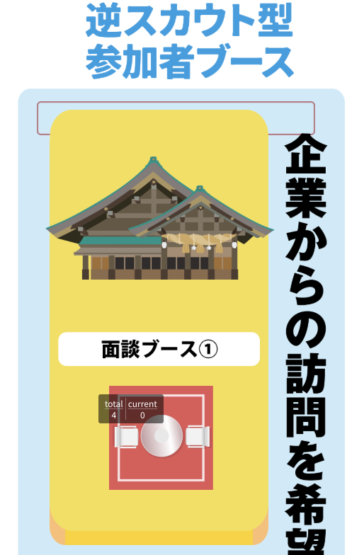 今回、実施した「逆スカウト型参加者ブース」では、来場者がブースに待機し、企業が訪問する姿も見られました。